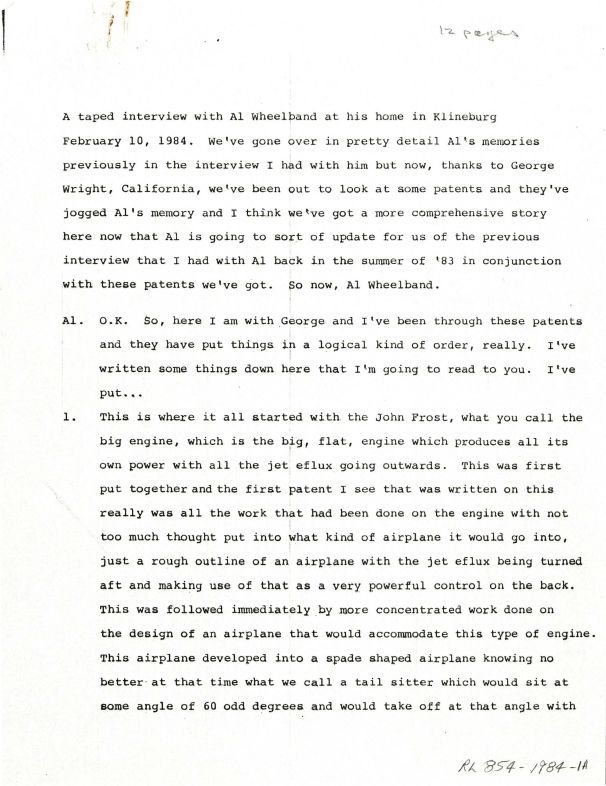 Subjects memories of Avrocar development. Names include Waclos Cherenski, Thomas Desmond (Des) Earl, John Carver Meadows Frost, John Dawbry.