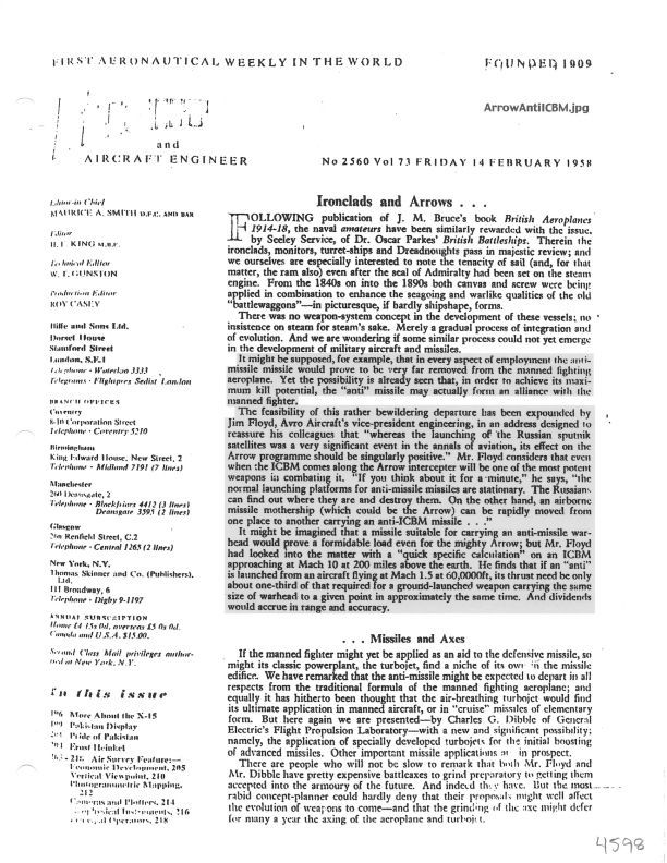 The evolution of the warship is compared to the evolution of aircraft - in particular the feasibility of an aircraft such as the Arrow to be a potent platform to launch a anti-ICBM missile.Publication Details