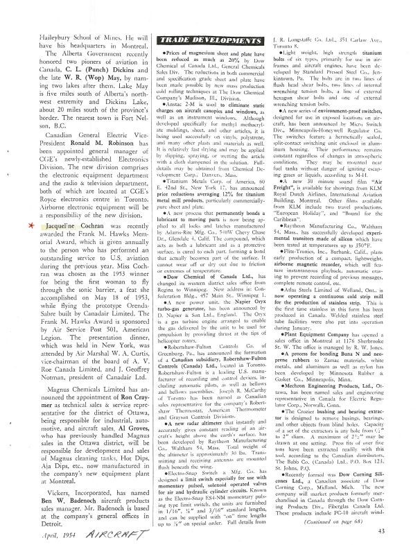 From Aircraft 1954 Apr pg 43 - First female to pass sound barrier in Orenda driven Sabre wins 1953 award