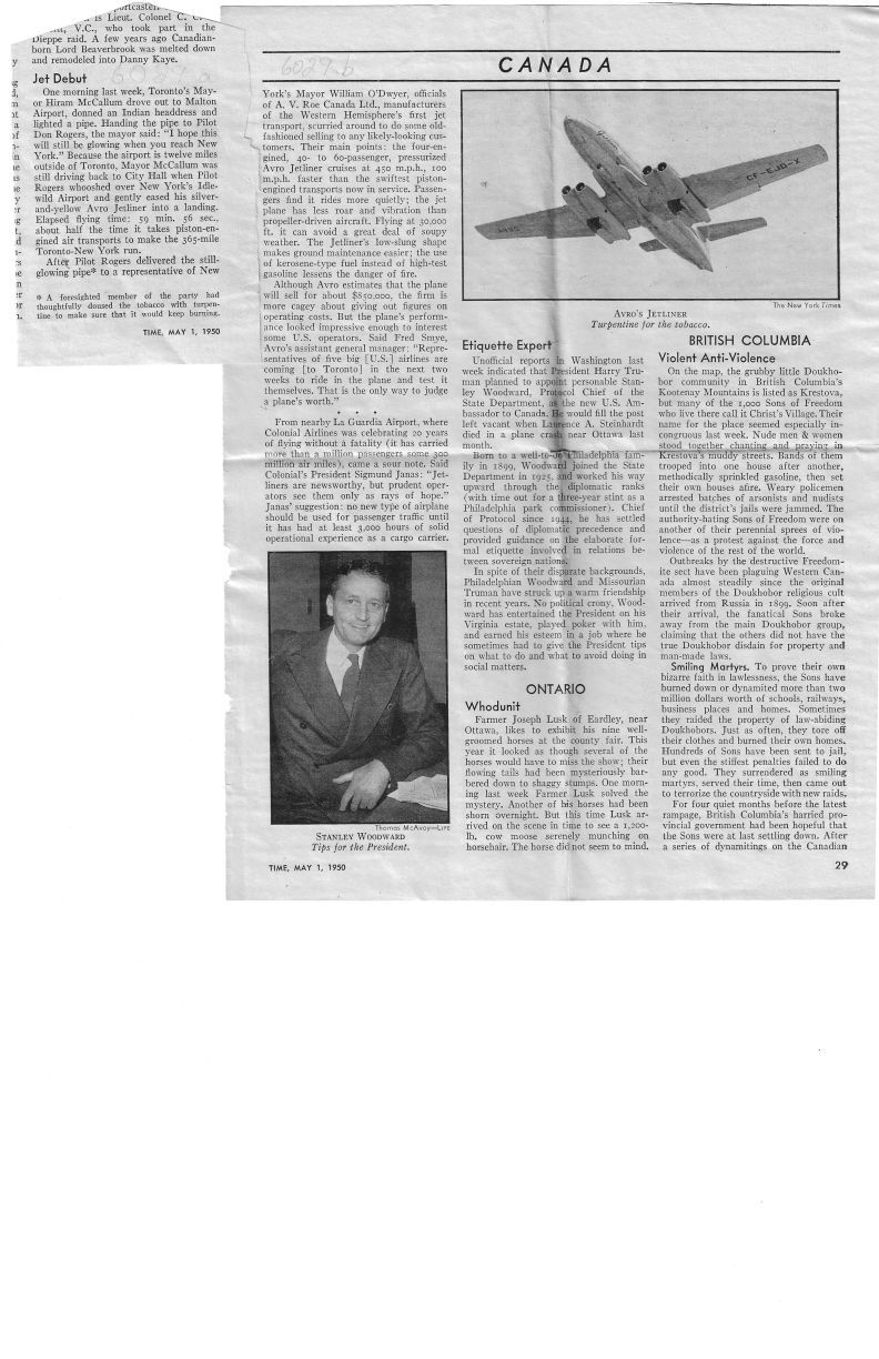 First Malton to New York Jetliner flight with image of underside of Jetliner. Story about lit pipe carried to NY. Names include Donald "Don" Howard Rogers, Frederick "Fred" Thomas Smye.General Notes