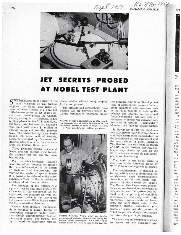 pg. 26, 27, 83, 84 Description of work at Orenda's Nobel site - images include Douglas Knowles demontrating the rig for testing Orenda compressors, W.S. Jones checking air compressor, Leslie Fielding checking compressor with stethoscope, W. Harry Gibson engineer in charge of the Avro gas turbine test plantPublication Details