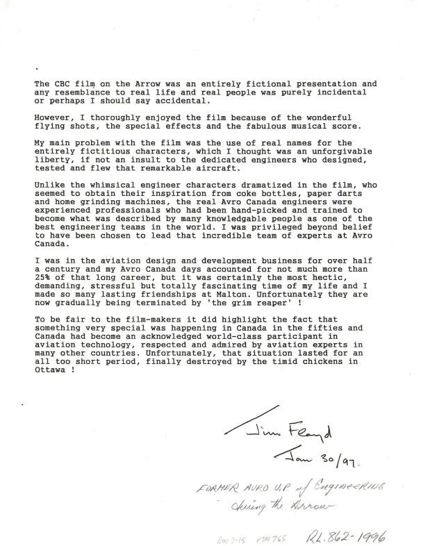 Jim Floyd's "positive" comments on the CBC film of the Arrow shown on December 16th, 1996Entry/Object ID