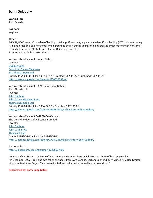 highlights some of the patents he was involved wth such as the Avro VTOL.