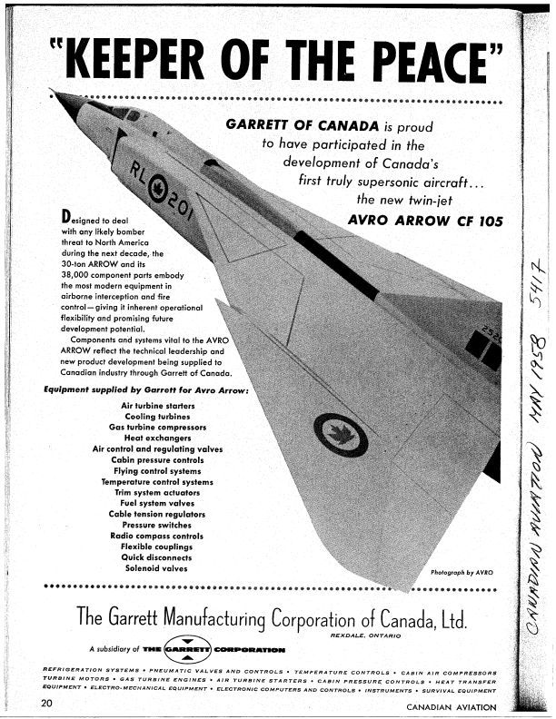 B&W ad for the Arrow, listing all the items provided by Garrett