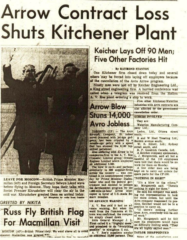 Story - Arrow Contract Loss Shuts Kitchener Plant - details about Keicher Engineering, Waterloo Manufacturing Company Ltd., Ledco Ltd, B and W Heat Treating Ltd, W. R. Elliott Ltd, B.F. Goodrich Canada Ltd all being impacted by Arrow cancellationPublication Details