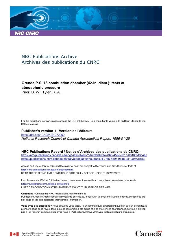An Orenda P.S. 13 annular, vaporizing combustion chamber having a 42-in. diam. air casing has been tested at atmospheric pressure without preheat. Items investigated: pressure loss, weak stability limits, weak ignition limits, outlet temperature distribution, flame pattern, combustion roughness including its causes and effects, mechanical failures, carbon deposition and overheating distortion.