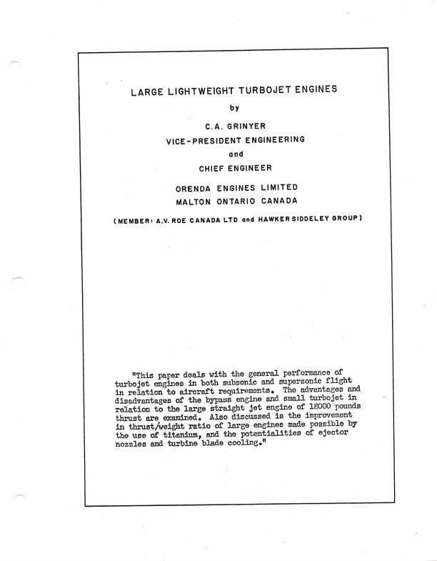 Detailed Narrative and Calculations of Large Lightweight Turbojet Engines by C.A. Grinyer, VP Engineering and Chief Engineer Orenda Engines Limtied