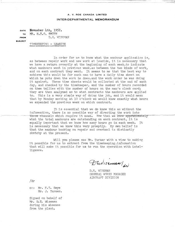 The need for a timekeeper and subsequent fallout is discussed in interoffice memos. Names include H.T.G. Smith, Frederick "Fred" Thomas Smye, J. Turner, Dennis E. Wiseman.