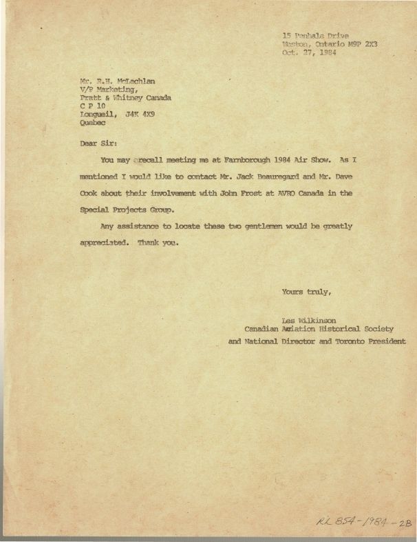 Les Wilkonson to R.H. McLachlan - Info Request Project Y