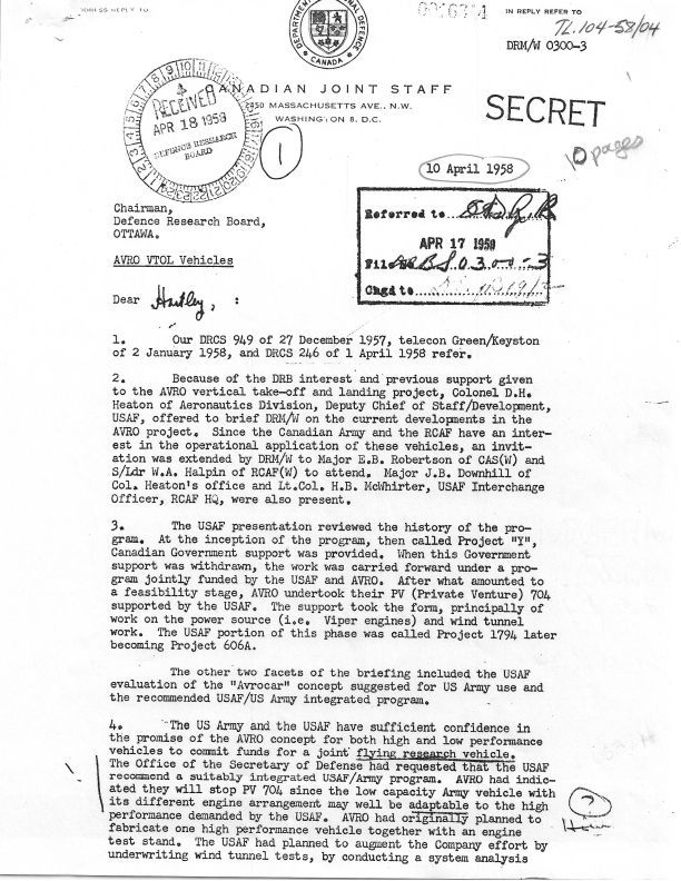 Letter by J.J. Green-Defence Research Board re AVRO VTOL Vehicles