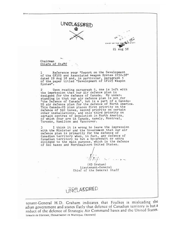 Chief of Staff note to Chairman regarding clarity of air defence, referencing "report on the development of the CF105 and associated Weapon System 1952-1958". Discusses impressions of the air defence plan vs first priority being the SAC bomber bases in the US, second other installations, and lastly the population centres of Canada. Note suggests misinformation provided to the government