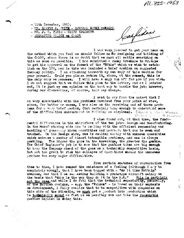 Commentary on a Memo from Harvey Smith regarding Policy on the Design/Production of CF-105General Notes