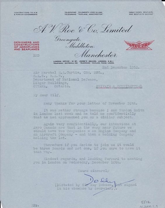 This letter discusses how Sir Roy had recently talked with Verdon Smith in London a week earlier and how Verdon brought up the subject of the letter - the intention of reorganizing Avro Canada into an aircraft company, an engine company and a holding company that holds both. Curtis is invited to join the Board.
