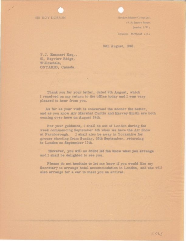 Letter acknowledges upcoming visit by Ted Emmert to England as President of Avro Canada. Letter states that W.A. Curtis and Harvey Smith and also travelling to England.