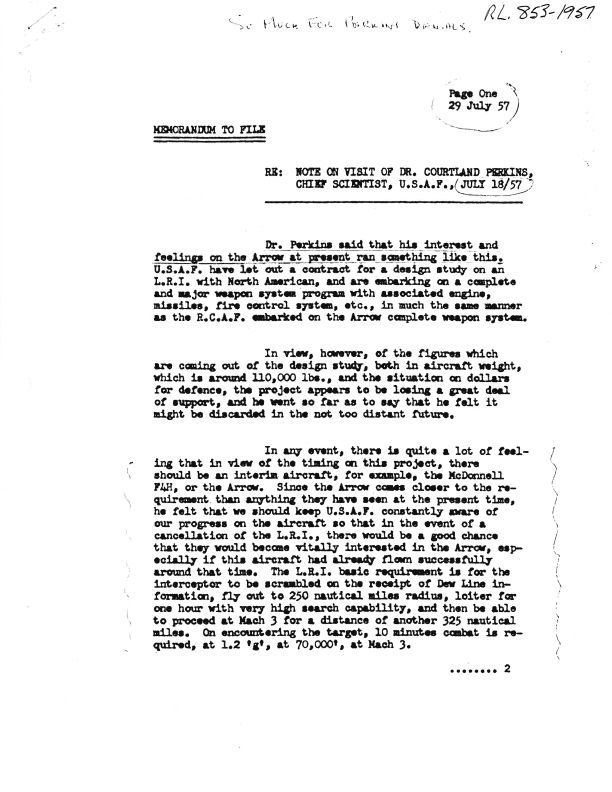 Letter J.C. Floyd memo to file - note on visit of Dr. Courtland Perkins, Chief Scientist, USAF July 18/57