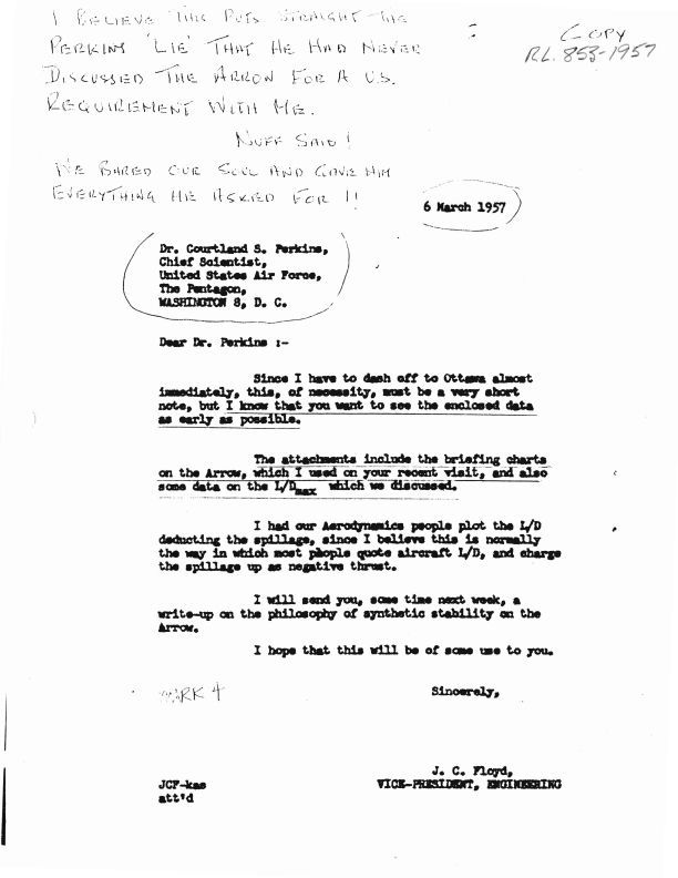 Letter J.C. Floyd to Dr. Courtland S. Perkins, Chief Scientist, USAF - attaching key CF-105 briefing charts which had been discussed
