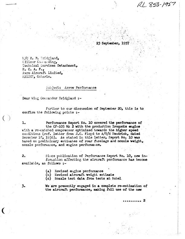 Letter J.C. Floyd to W/C E.P. Bridgland, Techical Services Detachment RCAF at Avro Aircraft Limited - Arrow Performance