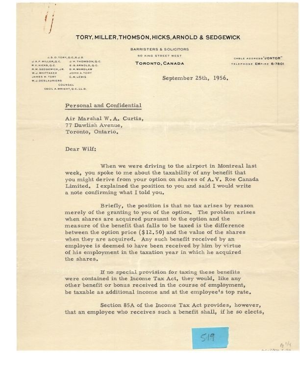 Letter - John Tory to W.A. Curtis Sept 25, 1956 (4 pages, separated)