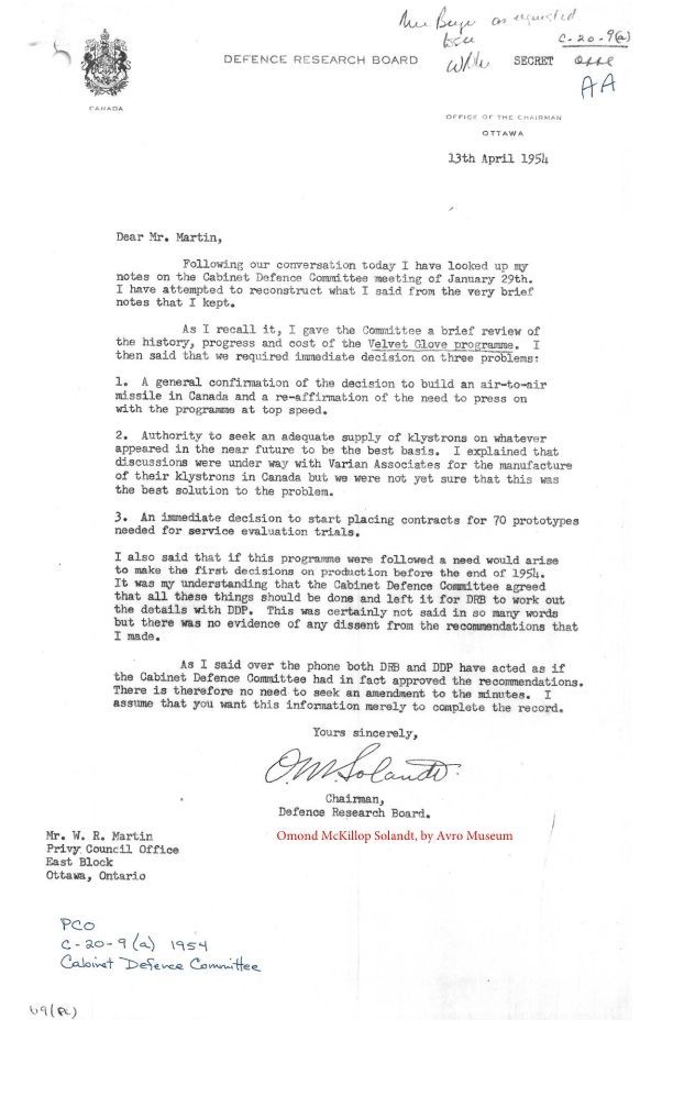 Letter from OM Solandt, Chairman of Defence Research Board, to W.R. Martin of the Privy Council Office regarding approvals to proceed with the missile system called Velvet Glove.