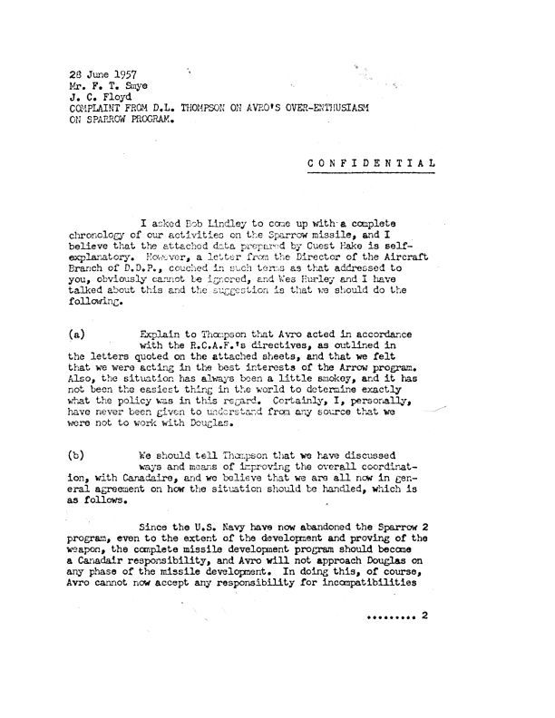 Letter to F.T. Smye Subject Complaint from D.L. Thompson on Avro's over-enthusiasm on Sparrow Program