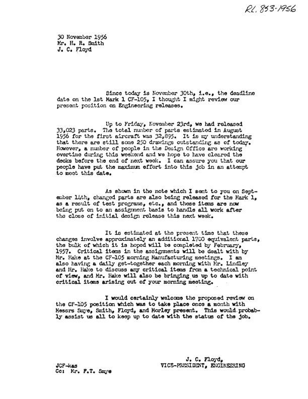 Letter to John McCulloch from Jim Floyd re: CF-105 Standard Aircraft Characteristics