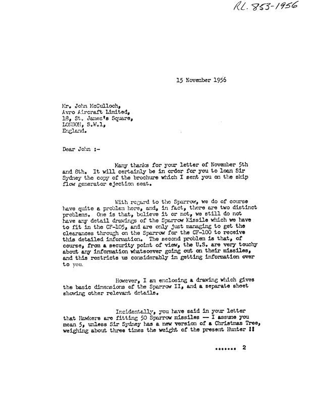 Letter to John McCulloch from Jim Floyd re: Sparrow Missle to fit CF-105
