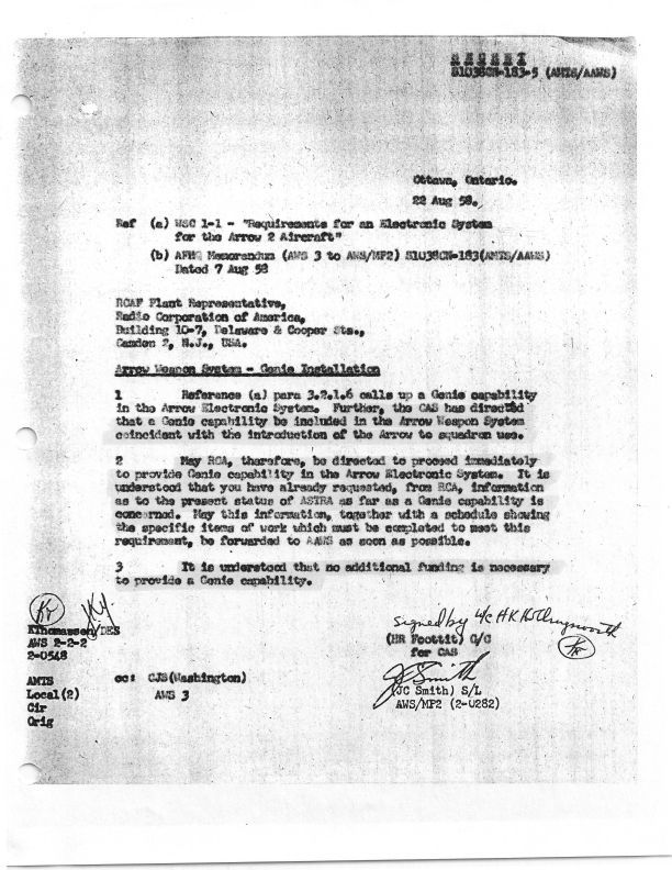 Letter to RCAF Plant Rep at RCA RE: Arrow Weapon System - Genie Installation