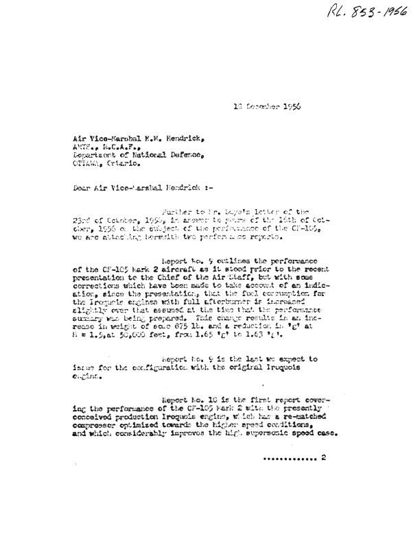Letter to Vice-Marshall Hendrick from Jim Floyd re: Performance of CF-105
