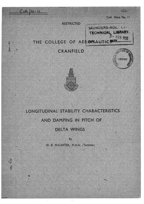 McCarter's Thesis for The College of Aeronautics at Cranfield - Longitudinal stability of 45 and 60 degree sweep angles (Delta wing) are addressed in subsonic, transonic and supersonic speeds.General Notes