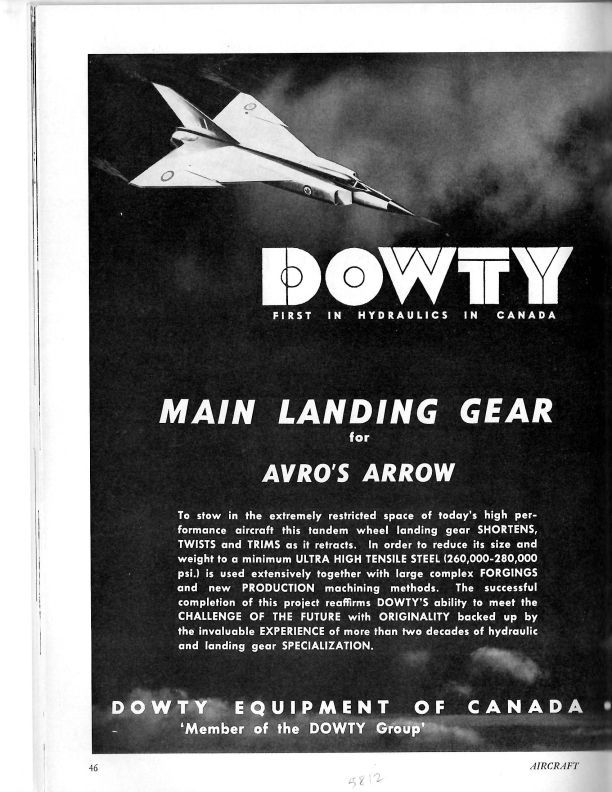 pg 46, 47 Advertisement by Dowty Equipment of Canada concerning the design and fabrication of landing gear for the Arrow. Includes a drawing of the landing gear and some of its components.Publication Details
