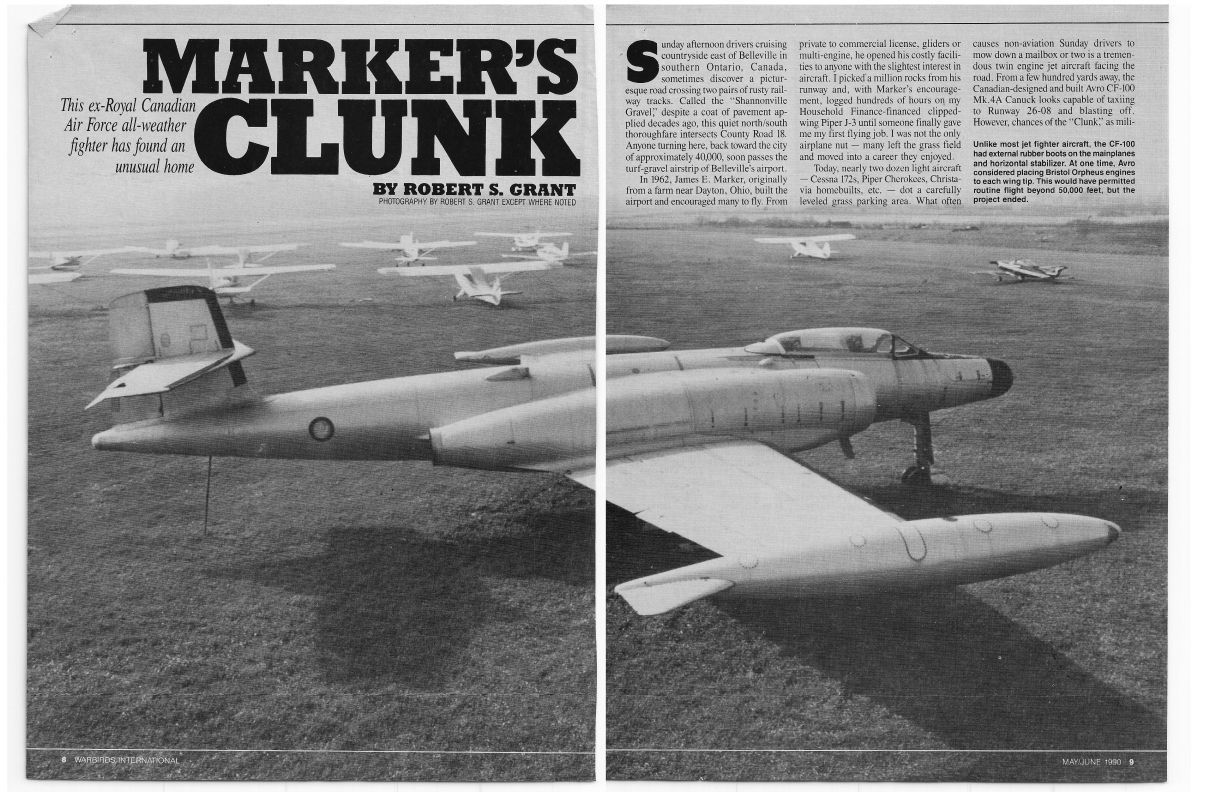 James E. Marker airplane museum, Belleville Ontario with photo of a CF-100 with no serial number shown but story indicates it is 18241. A/C originally from the Cobourg Museum. Story includes the C-102 Jetliner.