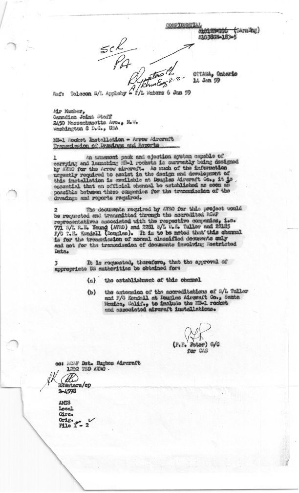 Reference to a telecon between S/L Appleby & F/L R.R. Waters - stating Avro requires information on the rocket and that official channels are required to facilitate it. These channels would be RCAF personnel stationed within Avro (S/L R.E. Young).