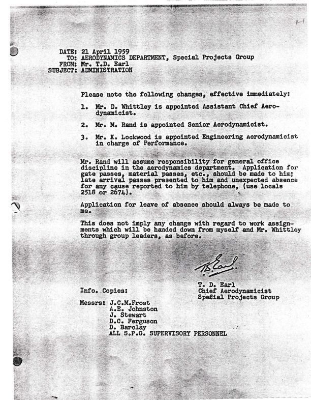 Memo to Aerodynamics Dept, Special Projects Group Re: Administration