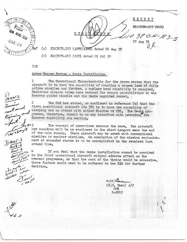 Memo outlining requirement for the Arrow to use both the Sparrow Guidied Missile and the Genie unguided rocket, both with conventional and nuclear warheads. This begins with 25238 (first operational aircraft). If schedule or cost issues arise, CAS (Chief of Air Staff) to be advised