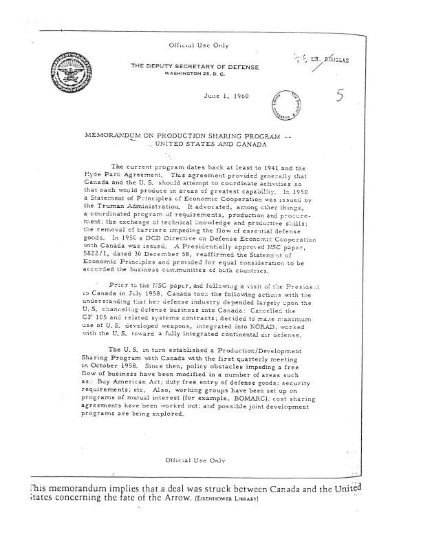 Implication of a deal with the US regarding fate of Arrow, Canada to be subcontractor. Generally a one sided affair with minimal work in Canada.
