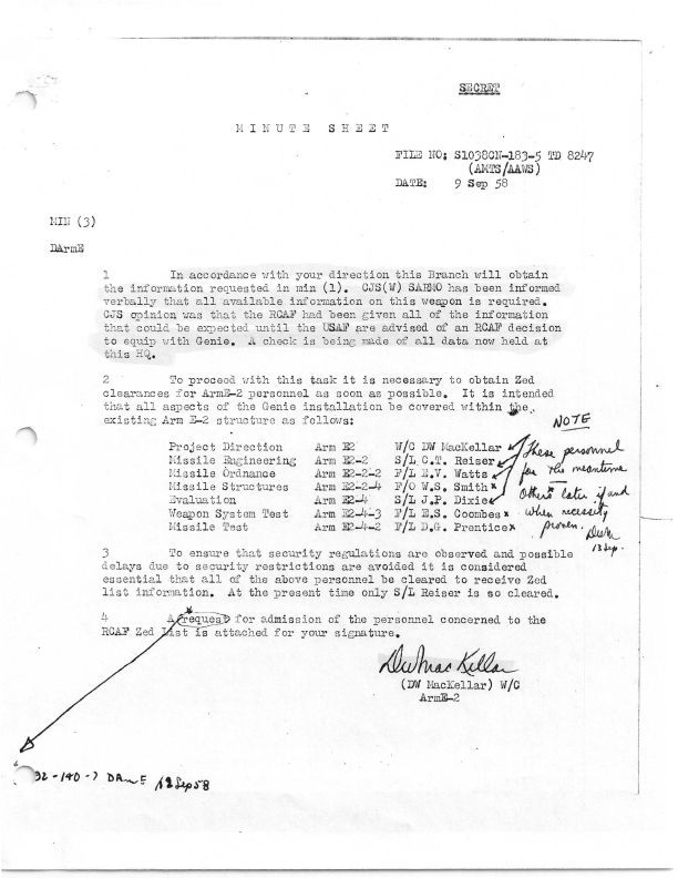 Memo to file regarding next steps for Genie. Military members named include F/L E.S. Coombes, S/L J.P. Dixie, W/C D.W. MacKellar, F/L D.G. Prentice, S/L C.T. Reiser, F/O W.S. Smith, F/L E.V. Watts.