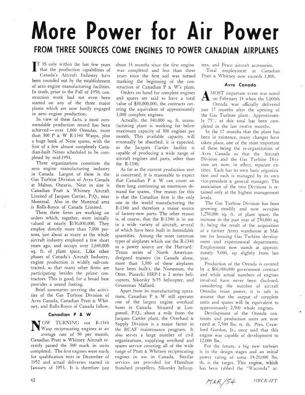 page 42,43 Avro Canada's Gas Turbine Division is featured in this story. Plant space has grown from 250,000 square feet to 1,250,000 square feet. Production of the Orenda is covered by a $66 million government contract. Turbine news, including the precursor of the Iroquois called the "Waconda" for the CF-105.General Notes