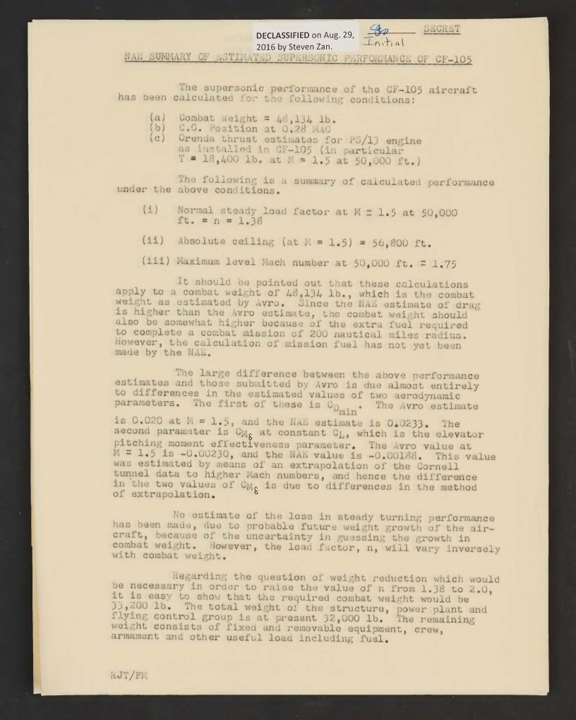 It should be pointed out that these calculations apply to a combat weight of 48,134 lb., which is the combat weight as estimated by Avro. Since the NAE estimate of drag is higher than the Avro estimate, the combat weight should also be somewhat higher because of the extra fuel required to complete a combat mission of 200 nautical miles radius. However, the calculation of mission fuel has not yet been made by the NAE.