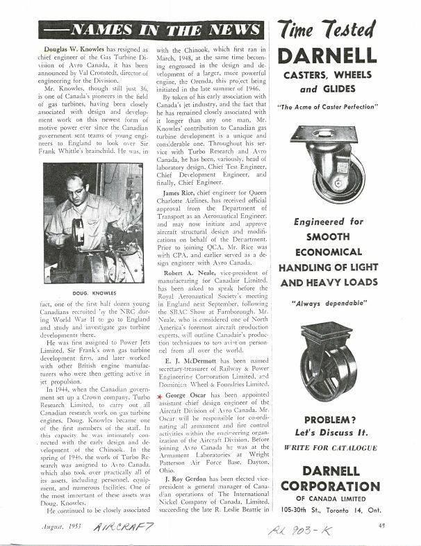 pg 43 Val Cronstedt announces Douglas W Knowles resigned as Chief Enginner, Gas Turbine Division - includes short bio and connection to the Chinook and Orenda. George Oscar named Assistant Chief Design Engineer of the Aircraft division of Avro CanadaGeneral Notes