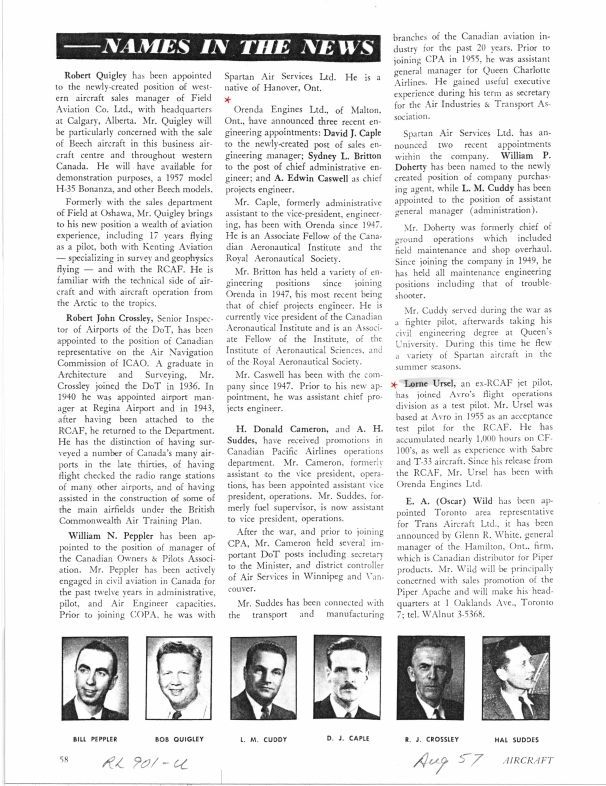 pg 58 David J. Caple named Orenda Sales Engineering Manager, Sydney L. Britton becomes Chief Administration Engeineer, A. Edwin Caswell is Chief Projects Engineer, Lorne Ursel joins as Avro test pilotGeneral Notes