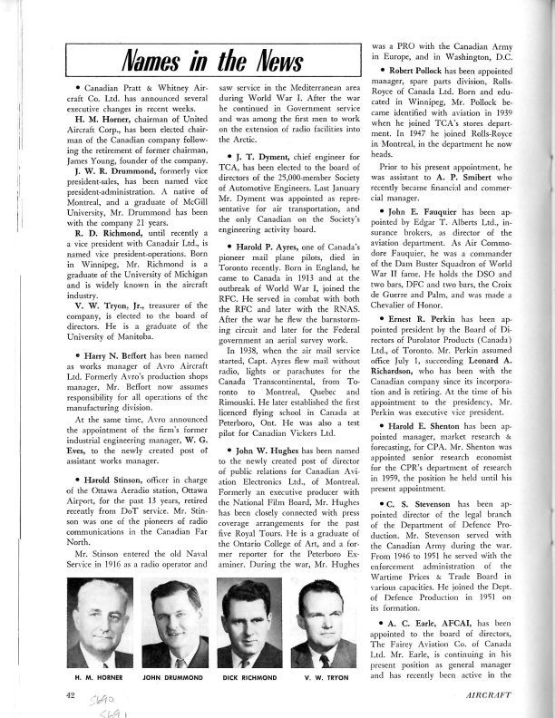 pg. 42-43 - Harry N. Beffort named as Works Manager of formally production shops manager. W. G. Eves promoted to assistant works manager from his old role of industrial engineering manager. Announcement that Kenneth M. Molson is appointed curator of the National Aviation Museum. Molson was formerly employed with National Steel Car Corp., Victory Aircraft, and Avro Aircraft Ltd. where he was Senior Standards Engineer.General Notes