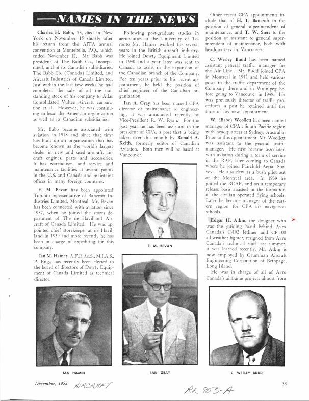 pg 33 - Edgar H. Atkin resigns after be sidelined. He was Chief Engineer for C-102 and CF-100. Val Cronstedt becomes Director of Engineering at Gas Turbine Division. Other names include Crawford Gordon, Jr. and Jim Floyd.General Notes