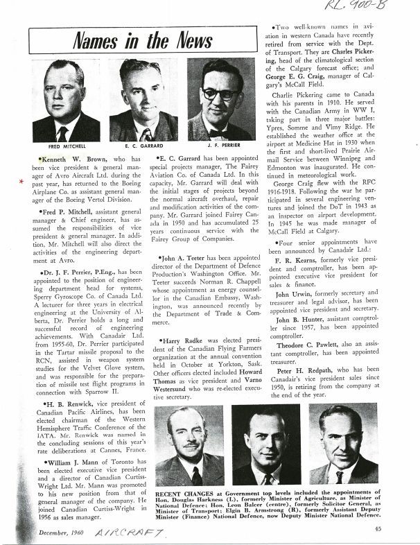 pg.45 - Fred. P. Mitchell promoted from Ass't GM and Chief Engineer to VP and General Manager, with add'l responsibility for the engineering department. Former Avro executive Kenneth Brown returned to Boeing Aircraft.General Notes