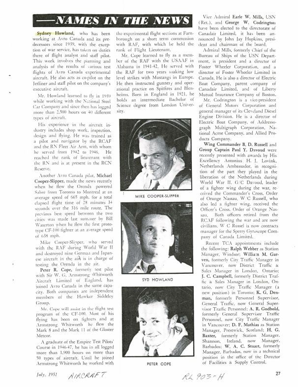 pg 27 Sydney Howland appointed flight analyst and staff pilot, story provides a mini bio. Michael Cooper-Slipper made the news when he fly an Orenda powered Sabre from Toronto to Montreal at an average speed of 665 mph with a flight time of 28 minutes beating the CF-100 record the year before set by Bill Waterton. Peter R. Cope joins Avro Canada as test pilotPublication Details
