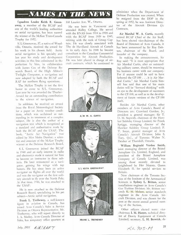 pg 35-36 Frank L. Trethewey Avro Canada's Sales & Service Division Ottawa Rep. Sydney L. Britton senior installations engineer in Avro Canada's Gas Turbine Division takes over as Chairman of the Toronto Section of the Institute of the Aeronautical Sciences, succeeding K.M. Molson, senior standards engineer at Avro Canada Aircraft Division. Avro personnel on advisory board, names include Air Marshal W.A. Curtis, Crawford Gordon Jr, F.T. Smye General Manager Aircraft Division, Syd Britton senior installations engineer, K.M. Molson senior standards engineer, L.H. Berwick design office group leader, K. Korsack group leader in the stress office, R.T. Gibson Avro Canada Stress Engineer, H.C. Luttman Avro Canada Contracts supervisor, J. Stalony-Dubrzanski aerodynamicist, and J.P. Uffen design engineerGeneral Notes