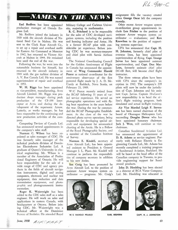 pg 69 Names include Earl Redfern production manager Orenda Engines, he started with A.V. Roe Canada Ltd gas turbine division in 1949 and W.H. Riggs VP Manufacturing, Avro Aircraft. Norman E. Kindell, J.L. Plant, Ian Craig, George Oscar, Len Fricker, Ken Knowlton.General Notes