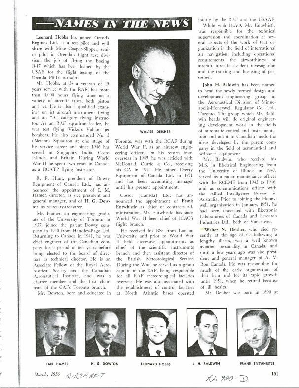 pg 101-102 Walter N. Deisher passes at 65, Deisher had FAI license signed by Orville Wright. Leonard Hobbs hired as Orenda test pilot.General Notes
