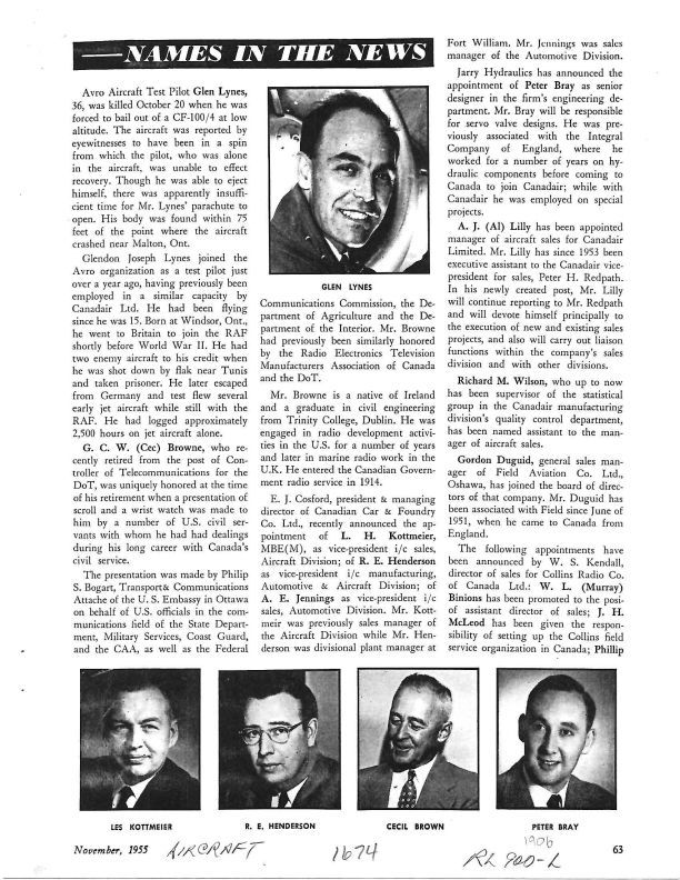 pg 63 Test Pilot Glen Lynes killed. pg 64 Wing Commander J.N. Brough (CO of RCAF technical detachment at Avro Aircraft), F.H. Keast and M.D. Willer named Chairman, Vice Chair and Secretary repectively of the Toronto Branch of the Canadian Aeronautical Institute. R. Phil Doyle contracts administratior, sales and service division of Orenda EnginesPublication Details