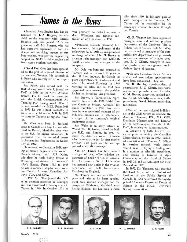 pg. 73 From Aircraft magazine 1959 Oct. - Magazine announcement that former Orenda chief service engineer J. Burgess has joined Standard Aero Engine Ltd. Photo included.General Notes