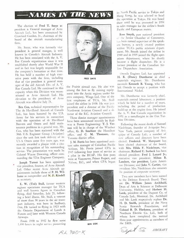 pg 50 Fred T. Smye President & GM Avro; Joseph Turner VP Finance, Avro' H.B. "Dunc" Dunthorne, Orenda Chief material engineer. Norman Edward Kindell as secretary, P.H. Williams as comptroller, Kenneth (Ken) B. Young leaves Orenda to join International Nickel.General Notes